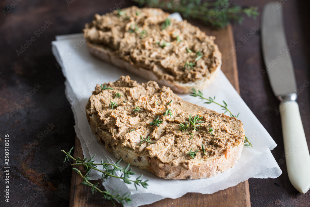 Fresh homemade chicken liver pate. Chicken liver pate on bread and in jar on a dark background