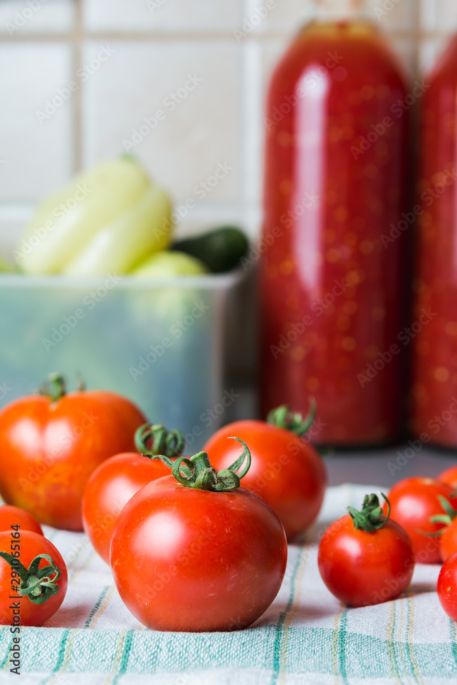 Fresh red tomatoes on a kitchen table waiting for preparation of the winter stores