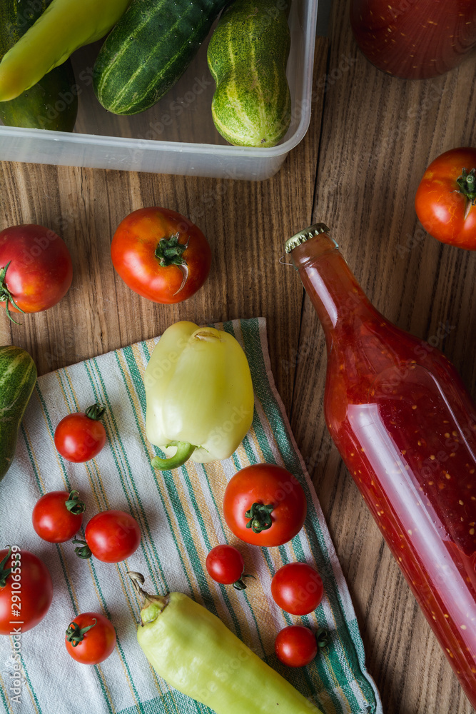 Fresh red tomatoes on a kitchen table waiting for preparation of the winter stores. Flat lay.