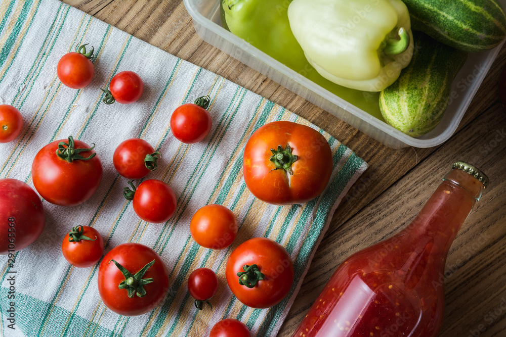 Fresh red tomatoes on a kitchen table waiting for preparation of the winter stores. Flat lay.