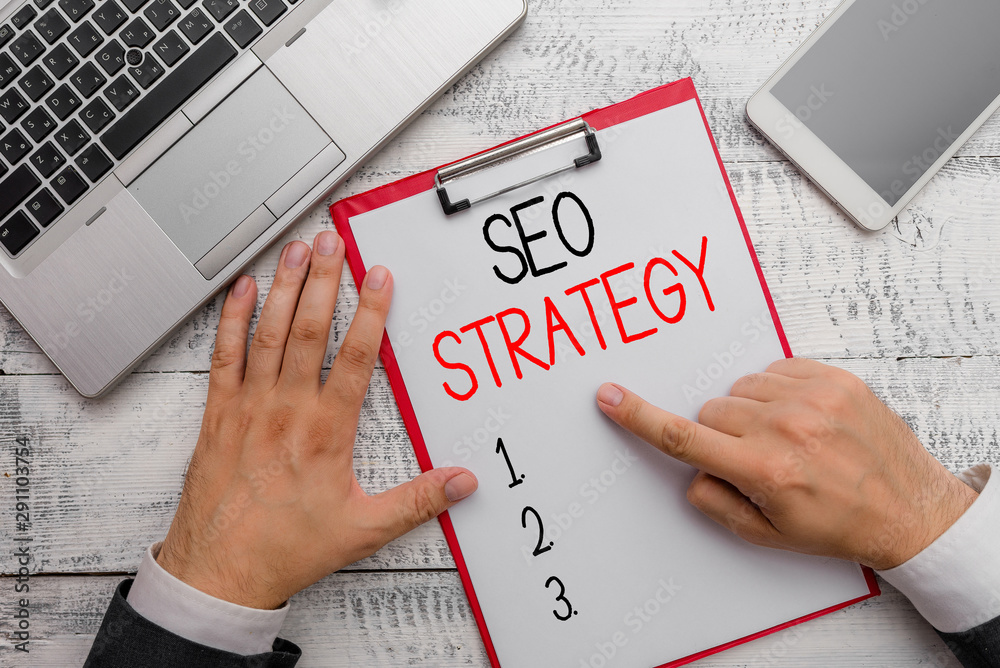 Writing note showing Seo Strategy. Business concept for Techniques and tactics to increase the visitors of a website