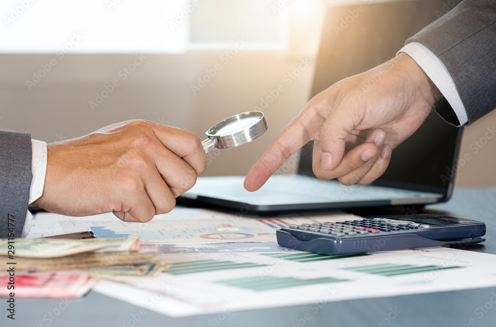 Businessman holding magnifier glass for financial data analysis and find the best company from stock market. Value investor concept.