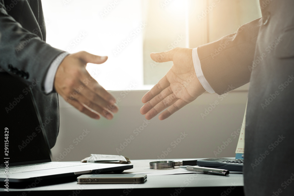 Businessman gesture shaking hand for successful dealing negotiation. They achieve and enjoy with marketing business meeting between supplier and customer.