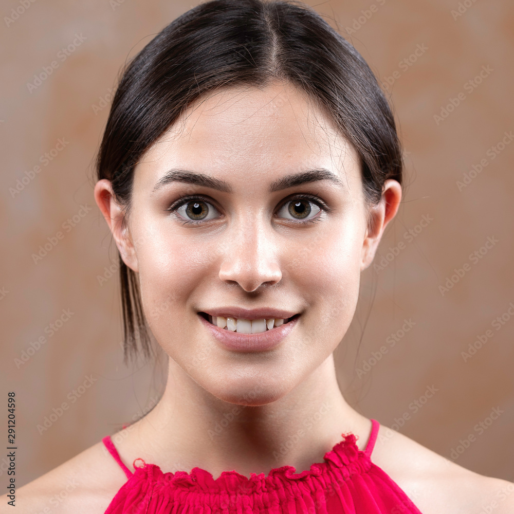 face portrait close up of a beautiful young girl with a gorgeous fabulous smile, cute big eyes and healthy perfect skin