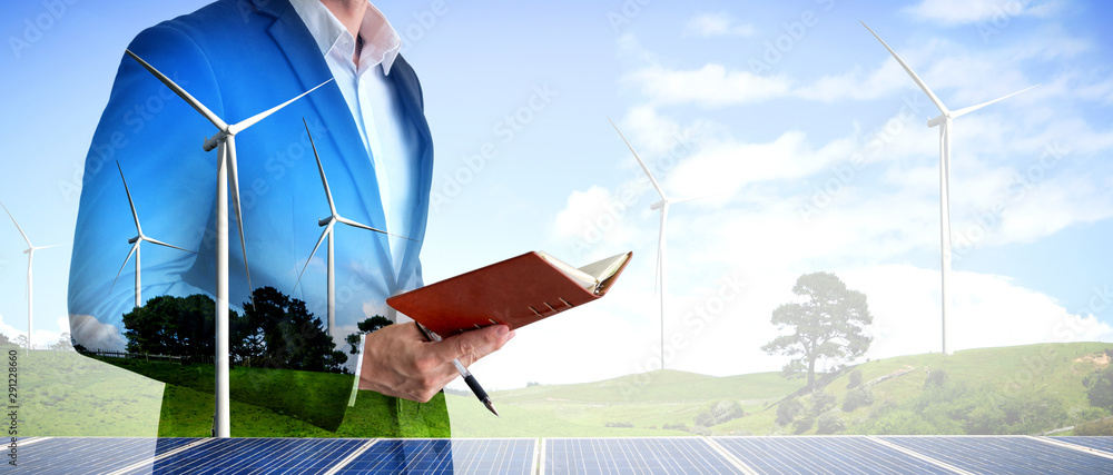 Double exposure graphic of business people working over wind turbine farm and green renewable energy worker interface. Concept of sustainability development by alternative energy.