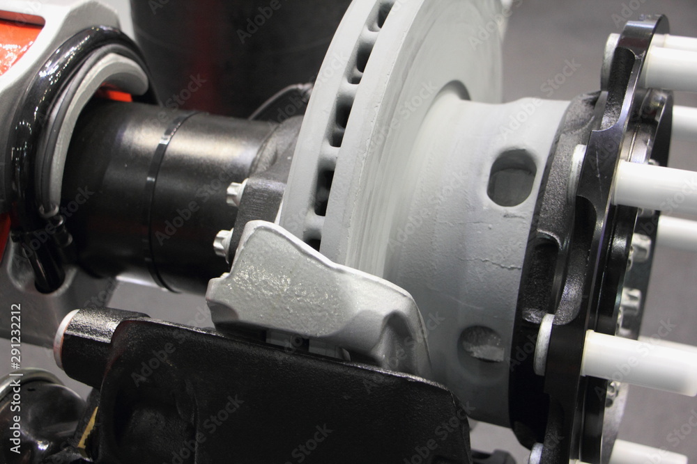 Disk brake truck trailer axle close up, heavy vehicle maintenance service