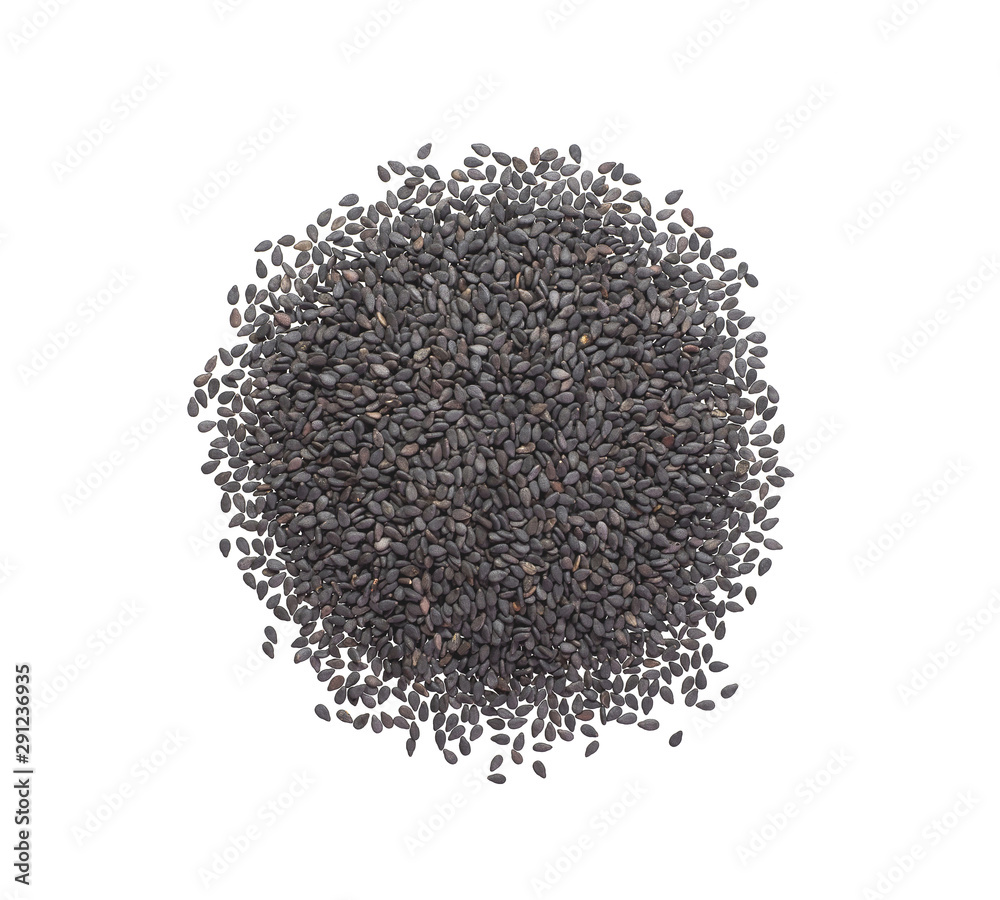 Black sesame seeds spread isolated on white background.Scientific name is Sesamum orientale L.Herb.top view.