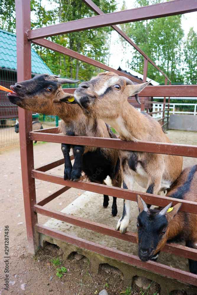 Hungry brown goats in the zoo