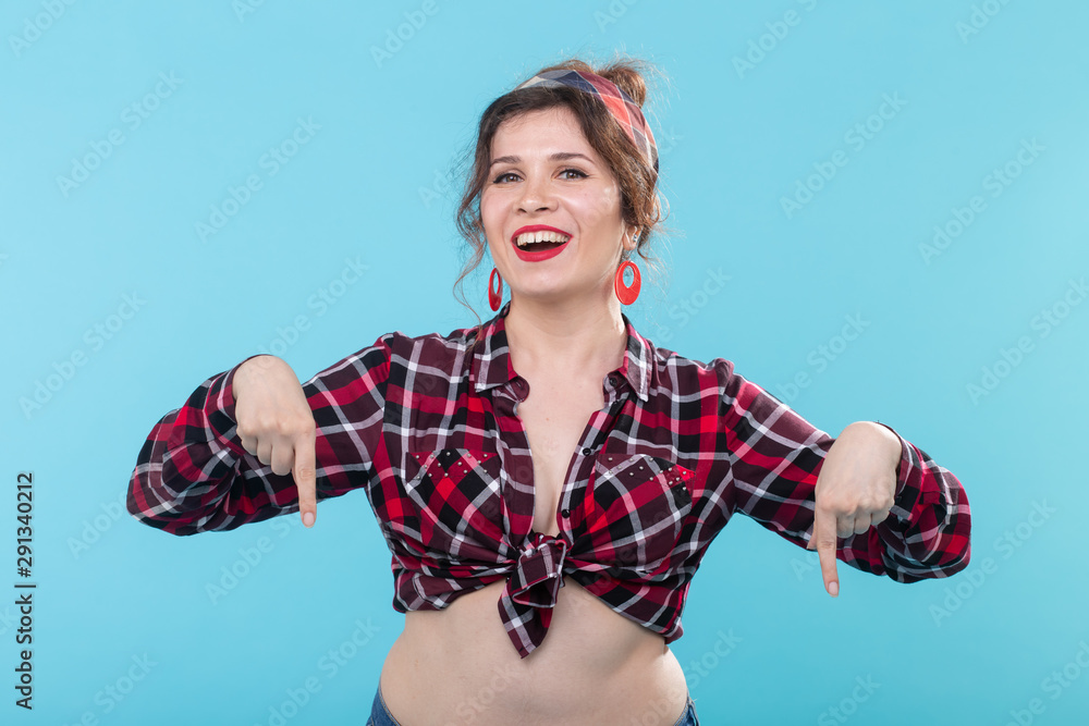 Cute positive young woman in a plaid shirt and bandage poses on a blue background and shows her fingers down. Concept of subscription link below.