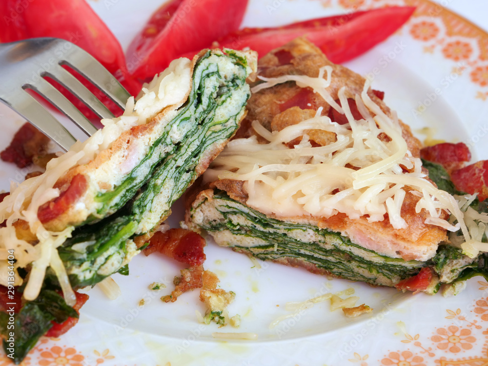 Bite of omelette with bacon, cheese and spinach on fork. Ketogenic folded omlette stuffed with low-carb high fat ingredients.