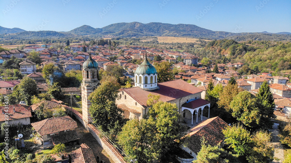 Elena aerial panorama with church and clock tower
