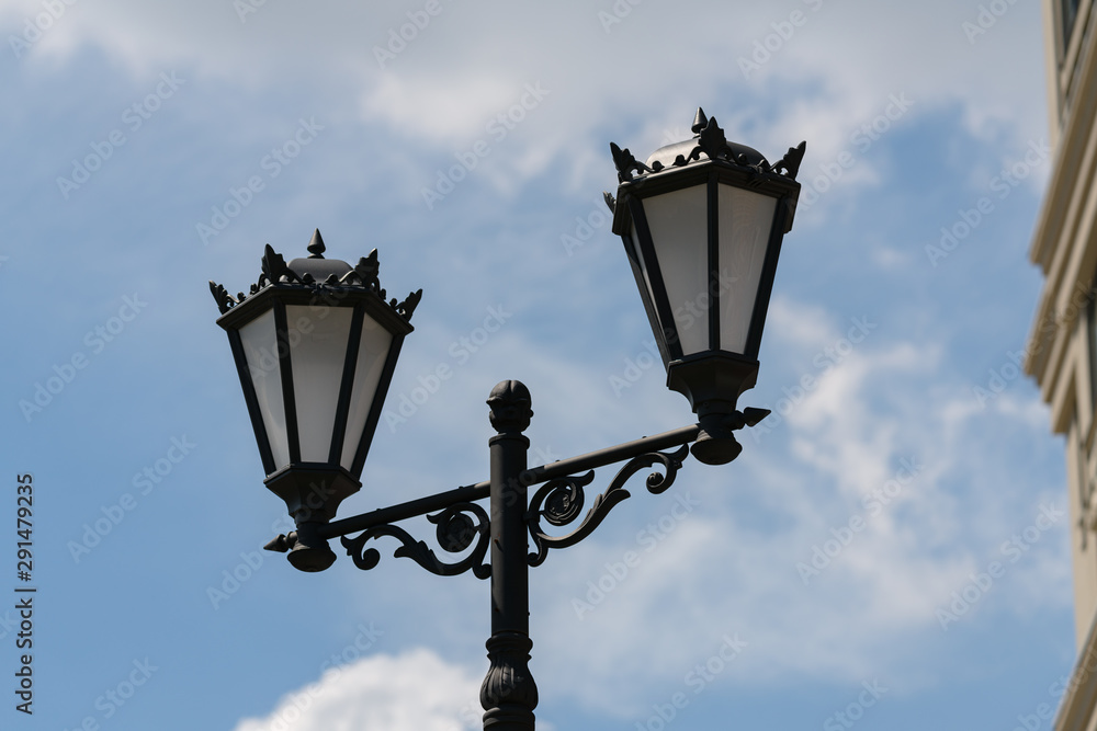 Lantern to illuminate pedestrian Boulevard on the background of pure cloudy blue sky. New Renaissance architecture residential building.