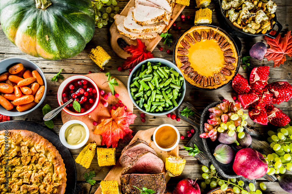 Thanksgiving family dinner setting concept. Traditional Thanksgiving day food with turkey, green beans and mashed potatoes, stuffing, pumpkin, apple and pecan pies, rustic wooden table