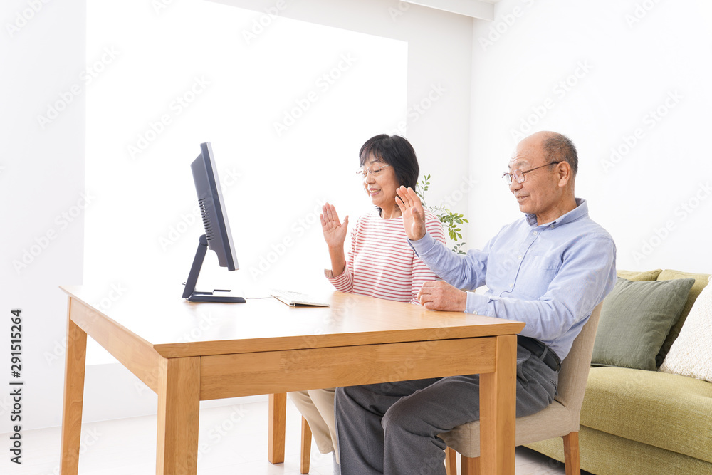 パソコンでテレビ電話をする高齢の夫婦