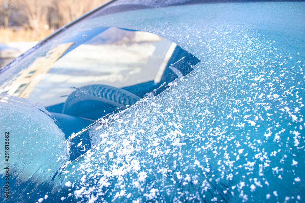 cleared the frost on the windshield in the cold, front and rear blurring the background