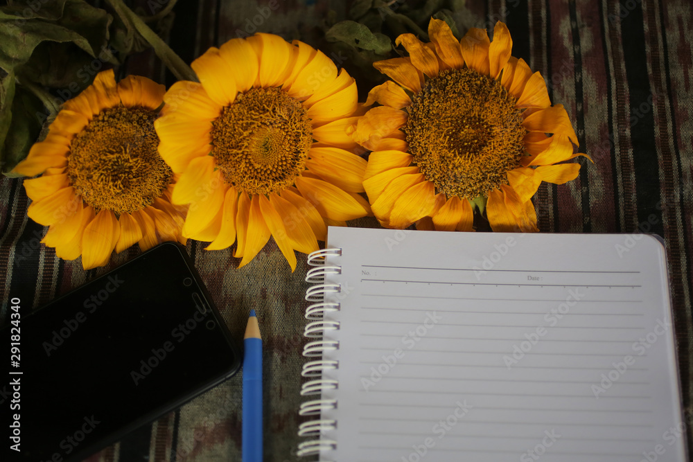 Notebook crop, sunflower and pen on classic fabric background. Office flat lay concept. Copy space for text and design.
