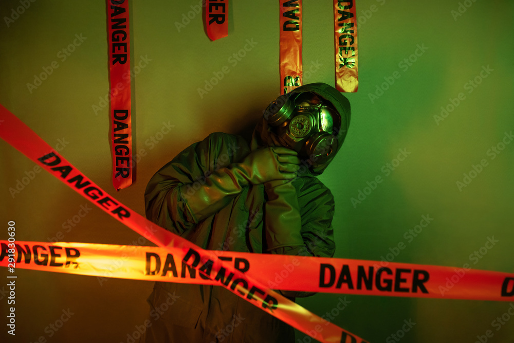 A guy in a protective suit with a gas mask on his face and a hood on his head and long rubber protective gloves posing standing near a green wall with hanging danger tapes and showing suffocation.