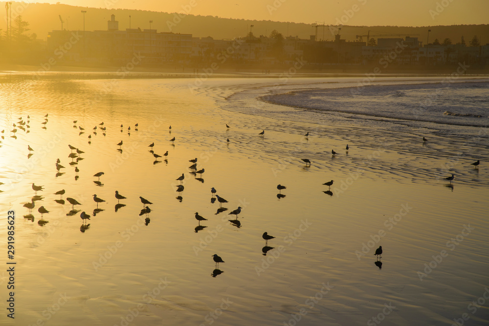 Sunrise ... Seagulls in the low tide of ocean