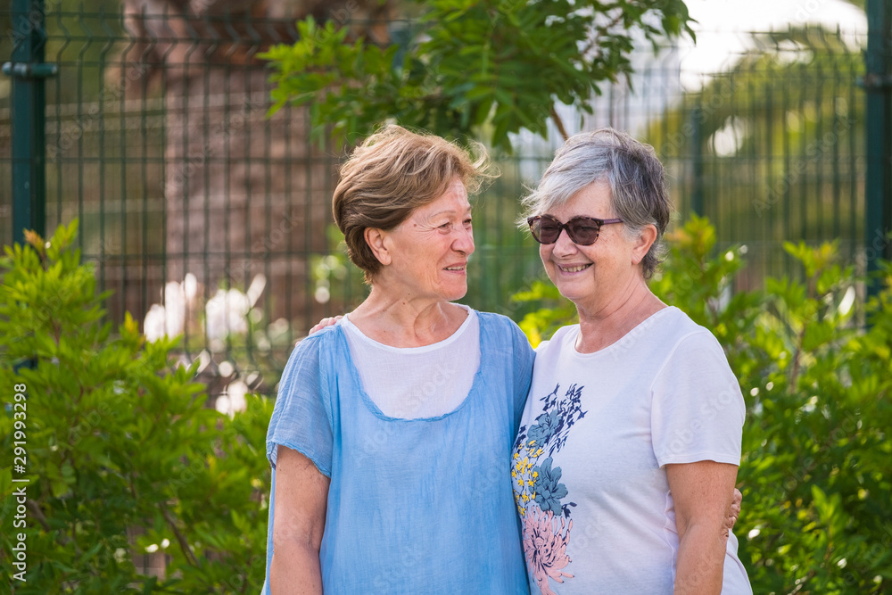 Portrait of cheerful happy senior old caucasian active woman outdoor enjoying friendship and leisure activity together - park background for retired lifestyle people