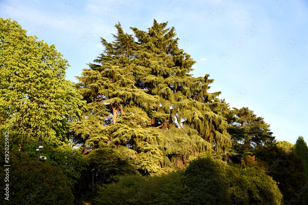 Sun rays are touching the leaves of a monumental tree creating beautiful greenish – yellowish colors for them