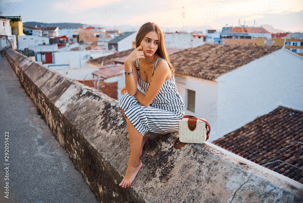 Young elegant barefoot woman posing on the street.