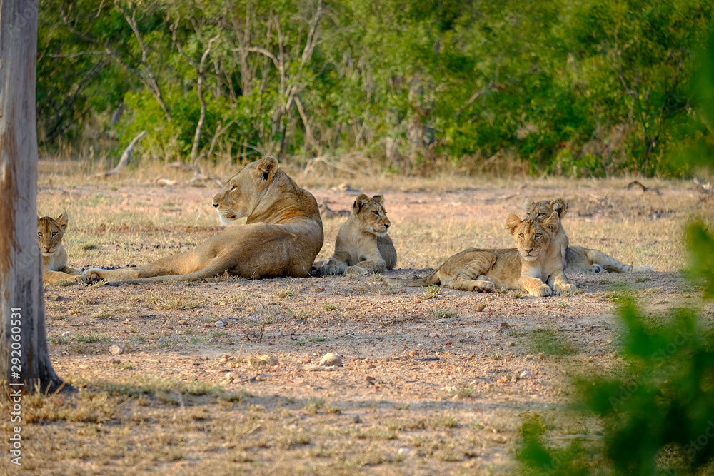 One lioness with four cubs laying down resting