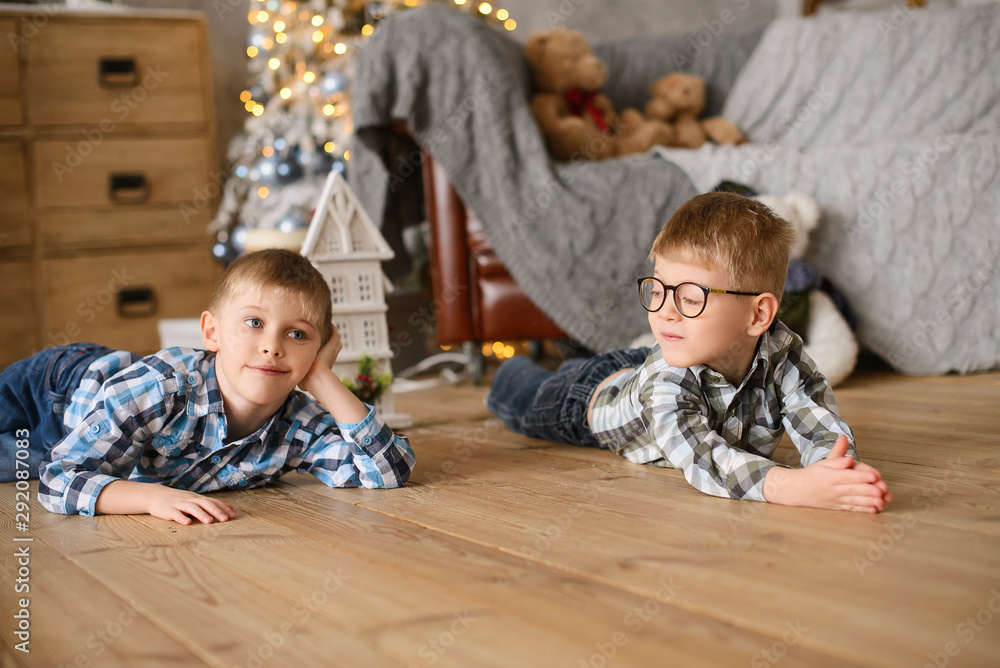 Two children, boys-brothers are lying on wooden floor, against background of Christmas tree, glowing with lights and bokeh