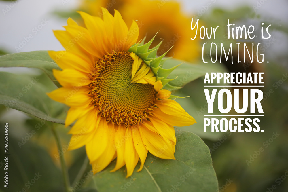 Inspirational motivational quote - Your time is coming. Appreciate your process. With an illustration background of beautiful sunflower starting to bloom in the garden.