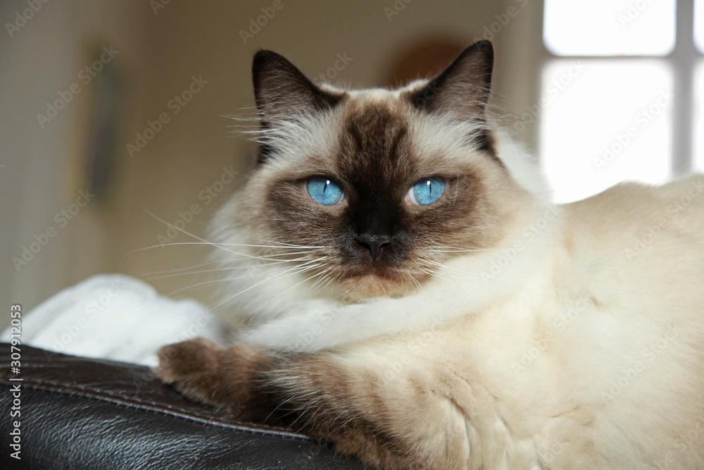 Ragdoll cat, small cute kitten portrait in funny pose at home