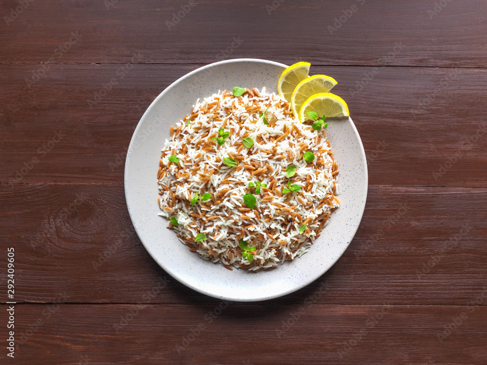 Turkish rice pilaf with orzo in a plate on a brown wooden background. Top view
