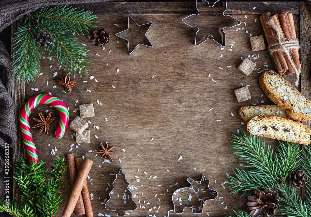 Christmas food background with fir branches, cones, winter spices and candies. Copy space for your text. Festive background.