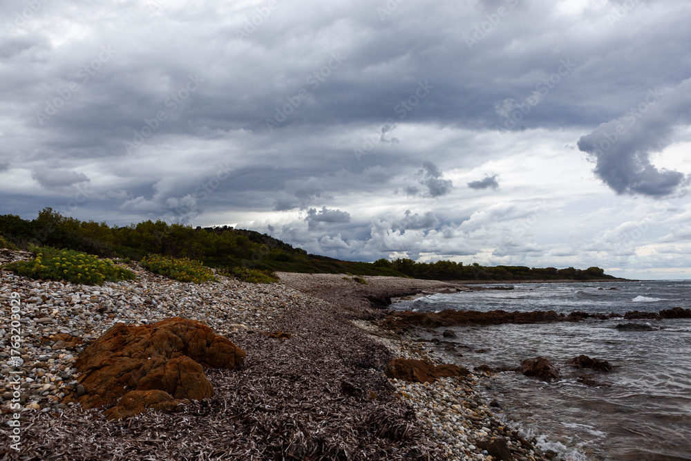 Marbled white (Melanargia galathea) female butterfly sits upside down on greater knapweed (Centaurea scabiosa) flower.