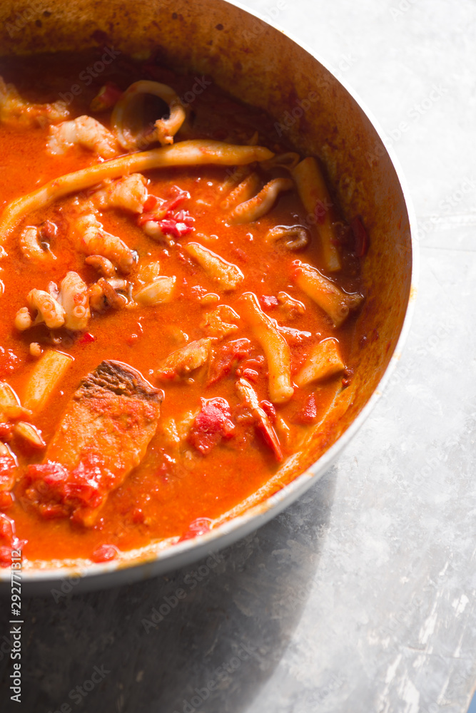 fish soup on an metallic pan, top view, natural direct light with shadow