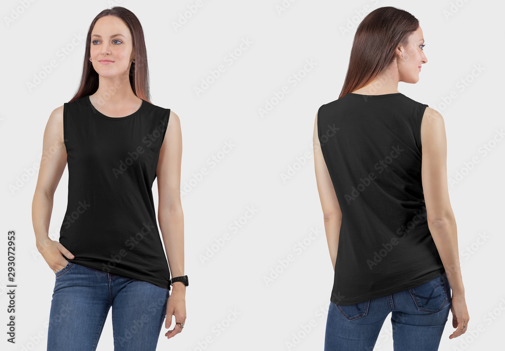 Front back view of female model wearing black sleeveless crew neck plain t shirt