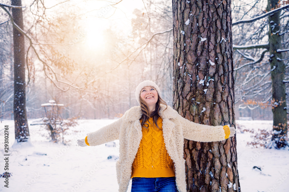 schöne glückliche junge Frau, die am Baum im Winterwald sich lehnt
