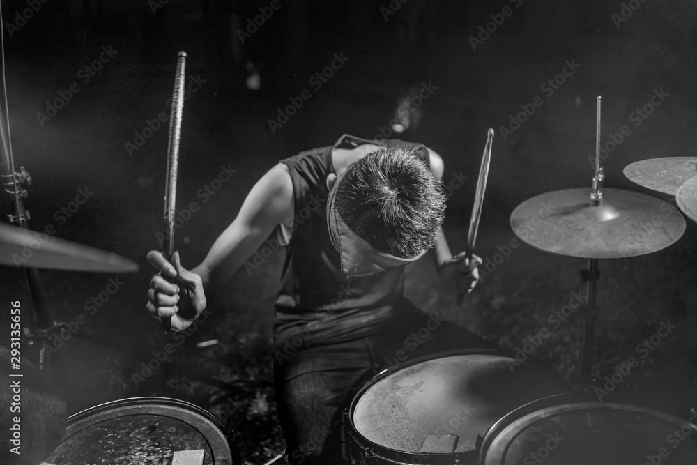 young boy as rock band drummer . Handsome and cool Asian American teenager in headband playing drum kit performing night music show as hobby