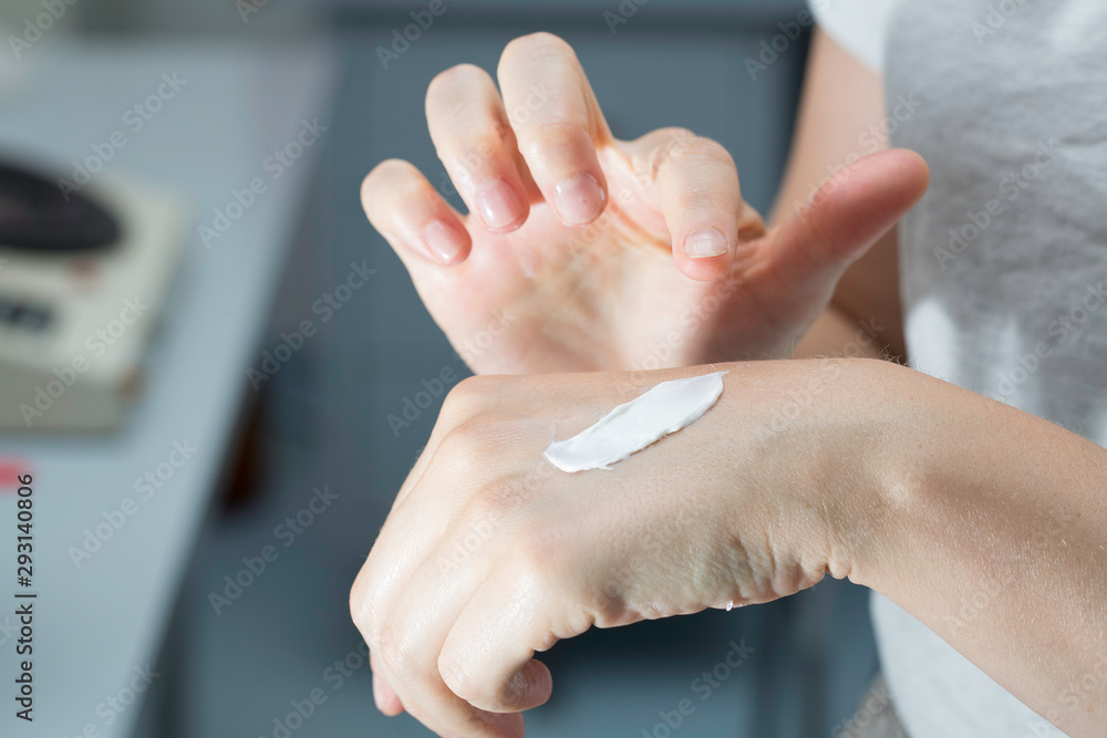An extreme close up view on the hands of a slim caucasian woman using her fingers to apply a rich moisturizer into the skin, health and beauty concept.
