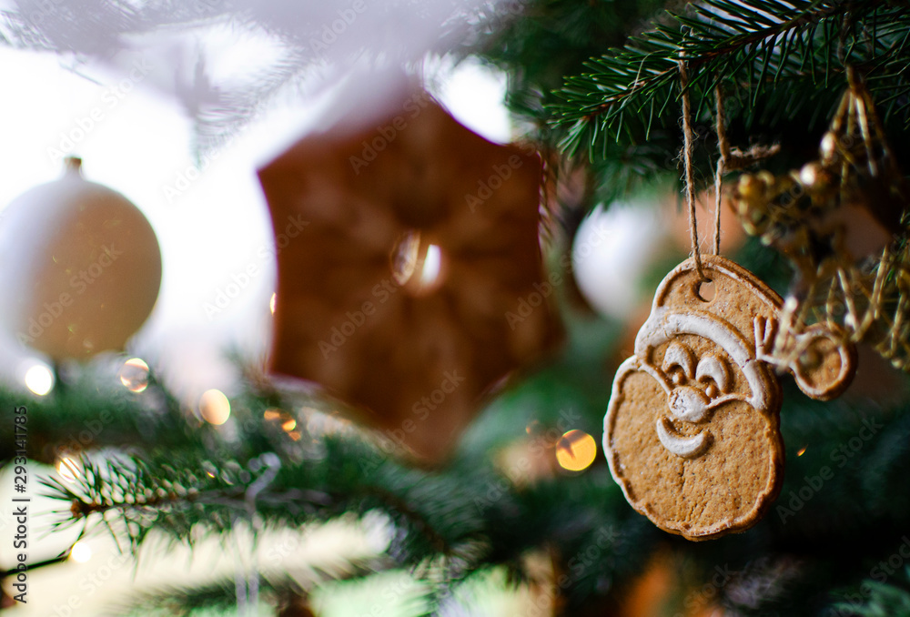 christmas decoration on tree . Handmade christmas cookies hanging on the green fir. Santa Claus.