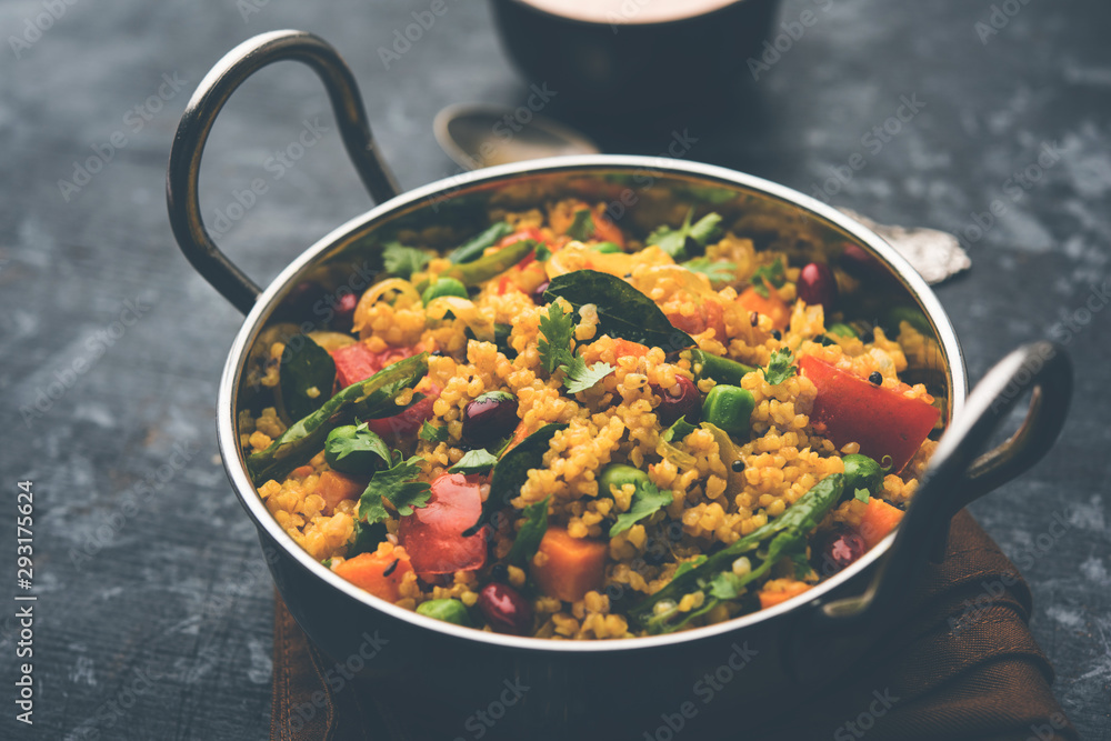 Broken wheat or Daliya Upma, served in a bowl. selective focus