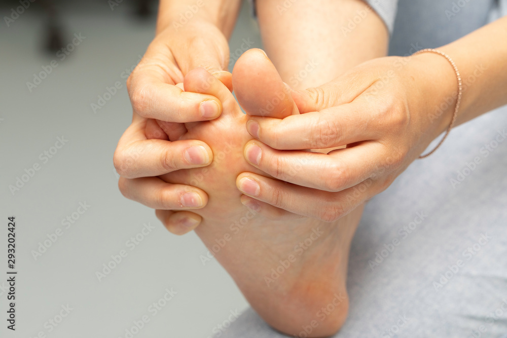 A closeup view on the underside of the foot of a caucasian woman, separating the toes to take a closer look of the pained foot, chiropody and arthritis concepts.