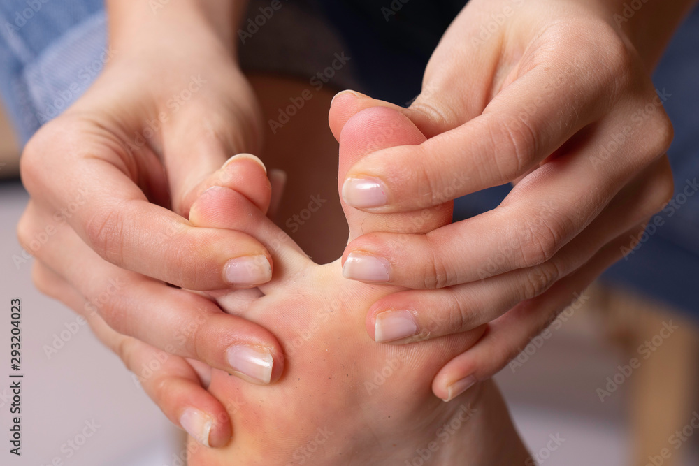 An extreme close up view on the foot of a young woman as she separates the toes with her fingers, checking cleanliness and causes of discomfort.