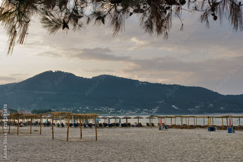 Evening view to the Golden Beach through the pine branches in Skala Potamias, Tassos island, Greece