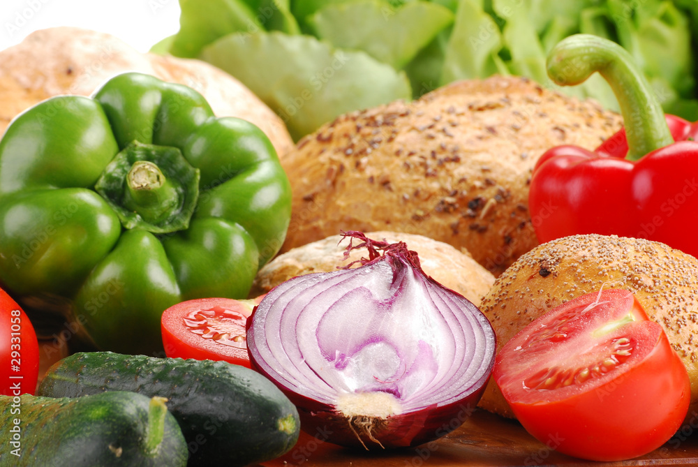 Composition with bread and vegetables on breadboard