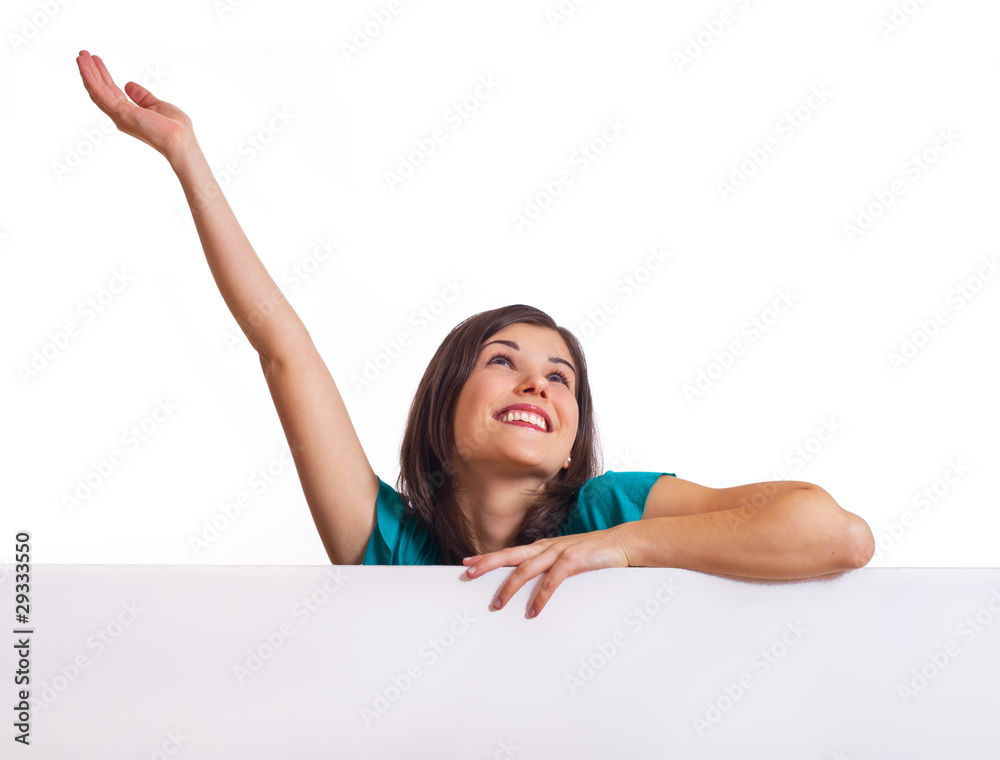 jubelnde Frau hinter Werbetafel schaut nach oben