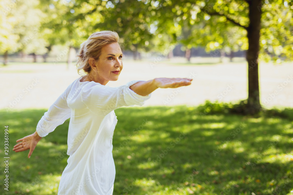Attraktive Frau im mittleren Alter macht Übungen im Park