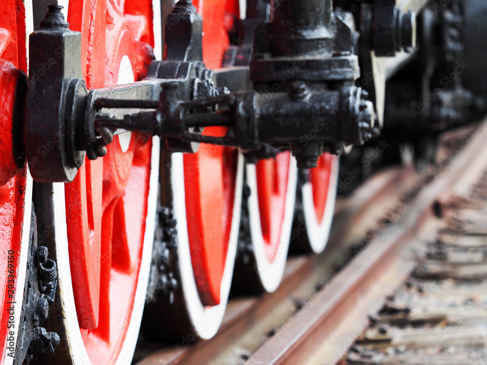 Railroad, train. Old diesel locomotive closeup, wheels on rails, red and black