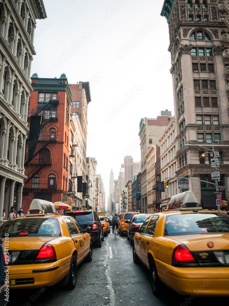 New York City iconic yellow cabs stranded in traffic jam at Soho neighborhood, New York City, Manhattan, USA