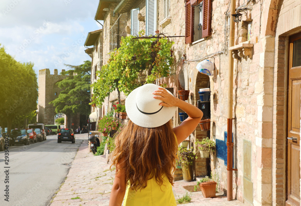 Beautiful young woman with yellow dress and hat walking in typical Assisi street, Italy. Rear view of happy cheerful girl visiting central Italy.