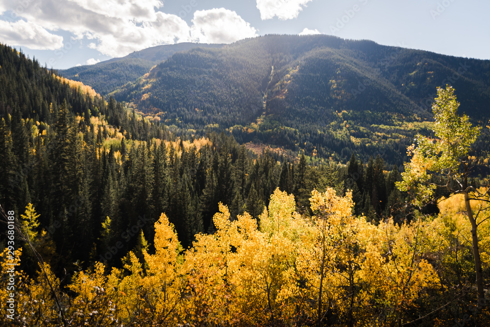 Landscape view of the mountains in Vail, Colorado covered in fall foliage.
