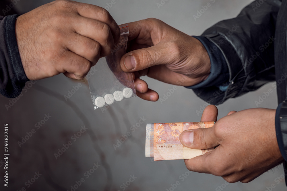 A person with money buys a dose of cocaine or heroin or other drug from a drug dealer